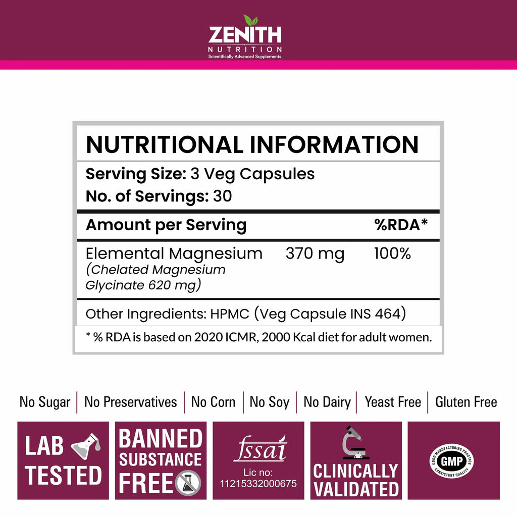 SUPERIOR CHELATED FORM - Zenith Nutrition Magnesium glycinate is the safe, gentle and effective form of magnesium bonded with glycine for superior absorption and digestive tolerance. Magnesium has an active role in hundreds of cellular functions including energy metabolism, glucose balance, nerve and muscle function. Manufactured at a GMP-certified facility and is free of gluten, soy, dairy, corn, sugars, yeast and preservatives.